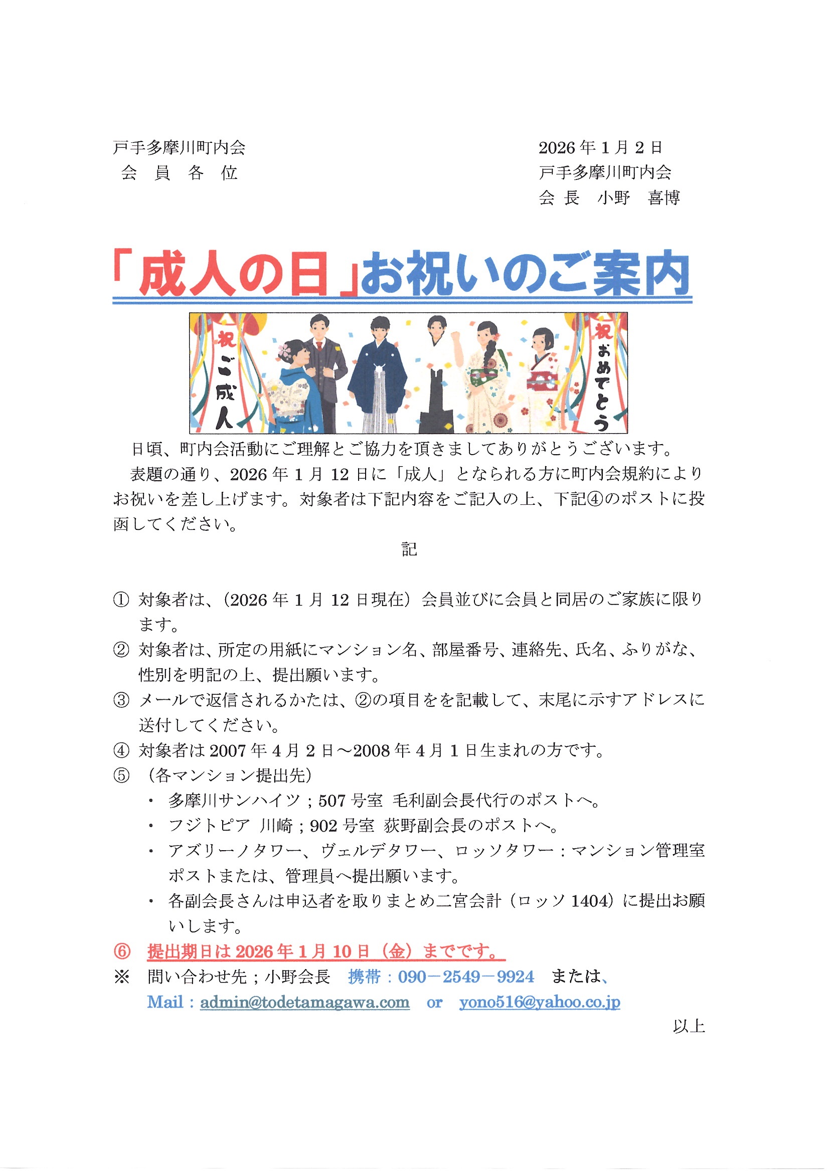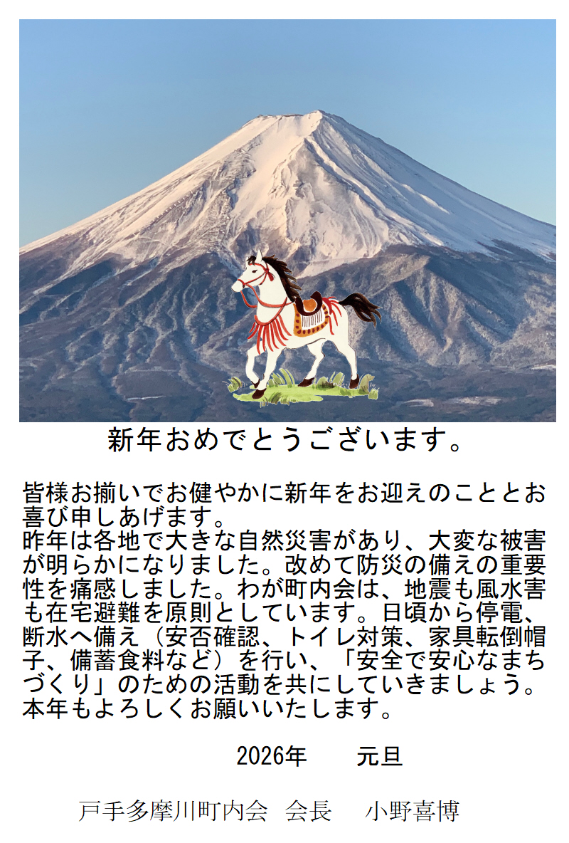 コロナ禍も3年目となりましたが、お健やかに新年をおむかえのことと拝察します。今年は、いろんな意味でふれあいの機会を多く作り、会員同士の交流を深めたいと念願しています。ホームページを通しての意見交換などもできるようにしたいと思っています。中断されていた町内会のイベントの復活や、災害時の在宅避難の住民向けパンフレットの作成や、防災訓練も再開したいと、思っています。どうぞよろしくお願いいたします。会長