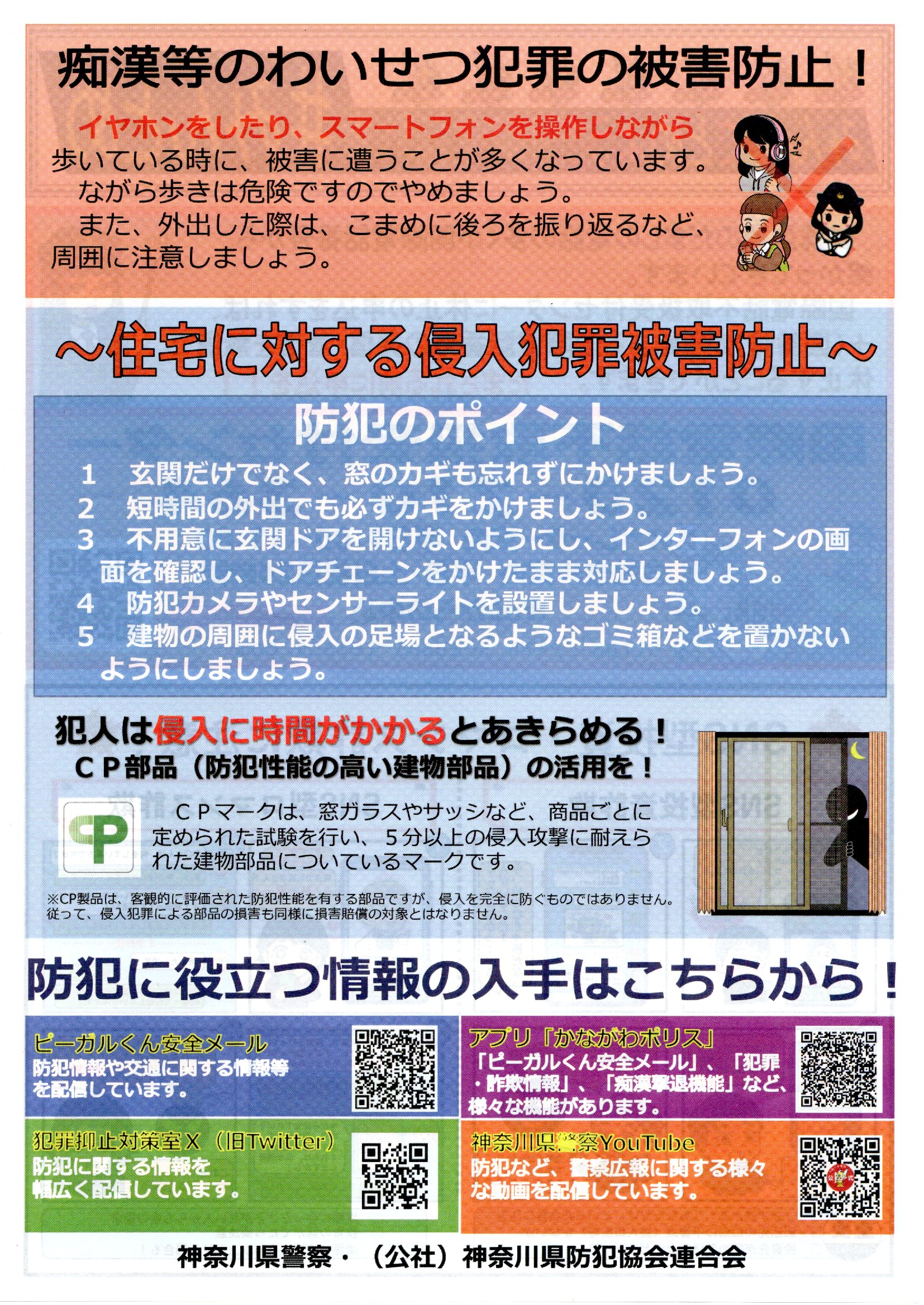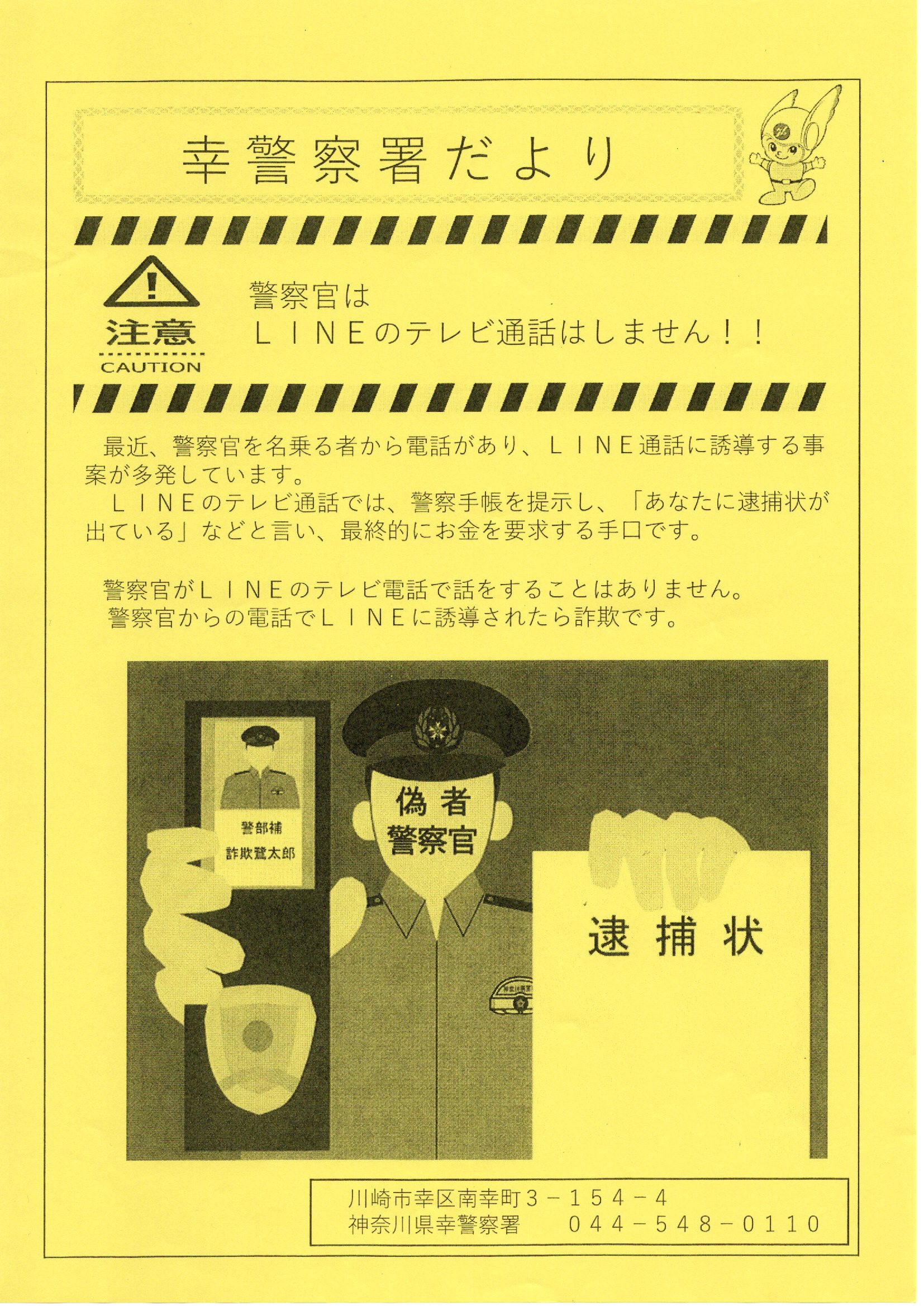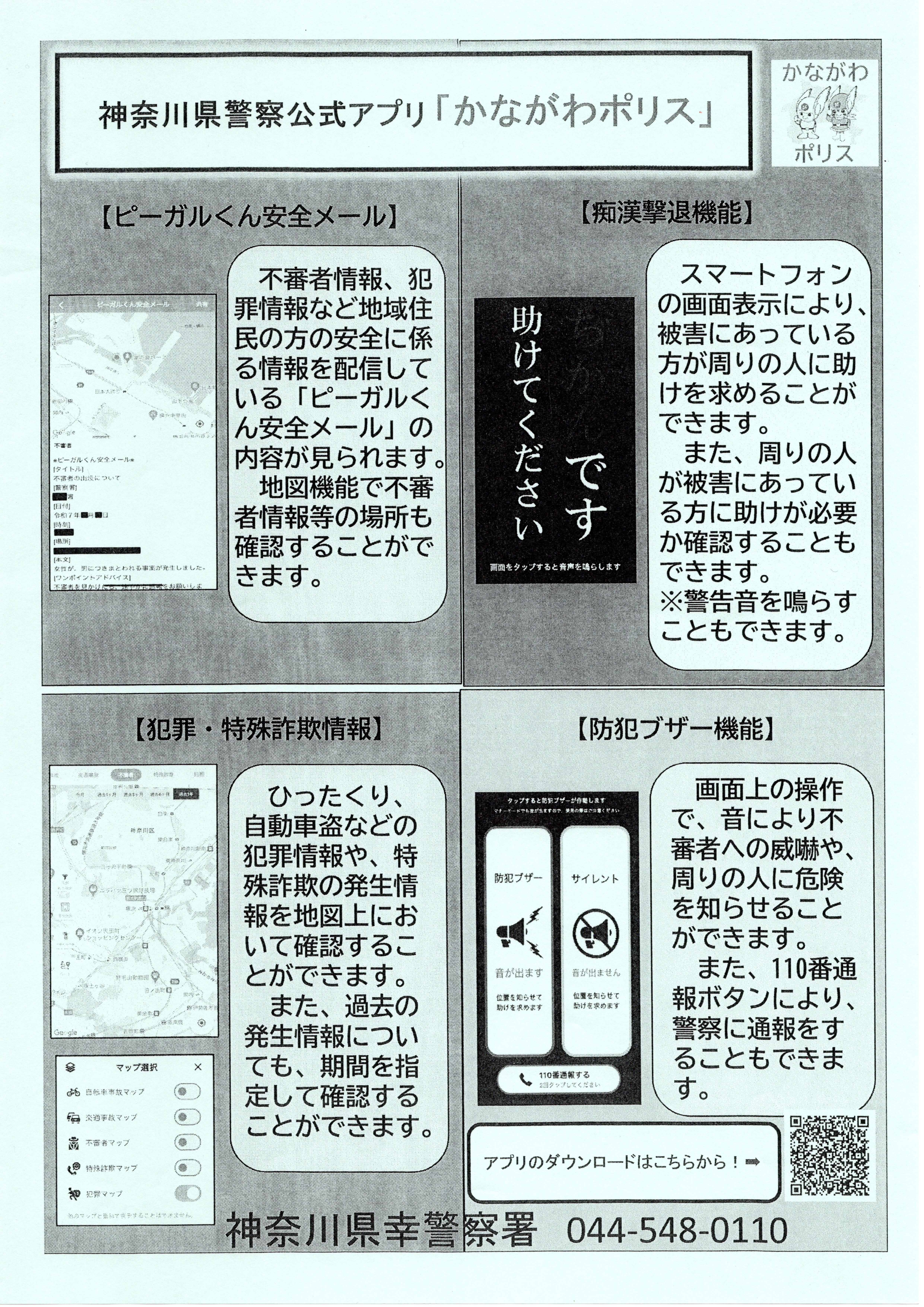 幸警察署の警部さんの最近の犯罪・事故状況の話を聞いた後、それぞれの地域のパトロールを実施しました。最近の特殊詐欺、自転車盗、自転車が絡む事故についての話がありました。ヘルメット着用の励行や、自転車の施錠、怪しい電話があった時の警察への通報など気を付けましょう。